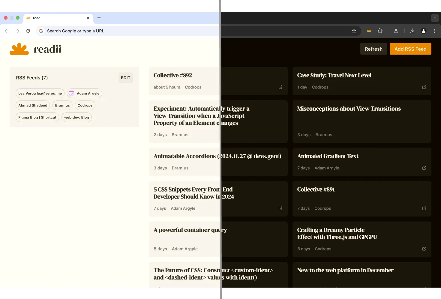 Das Theming der Anwendung passt sich den Nutzerpräferenzen, bzw den OS-Einstellungen des Nutzers an. Verwendet das Betriebssystem, zum Beispiel weil es dunkel ist, das Dark Theme, so verwendet auch der RSS-Reader dunkle Hintergründe aus der Farbpalette. Ebenso verhält es sich für helle Farben beim Light Theme. Dieser unterstützt zusätzlich die Lesbarkeit bei Verwendung der App im Freien bei hohen Umgebungslicht.