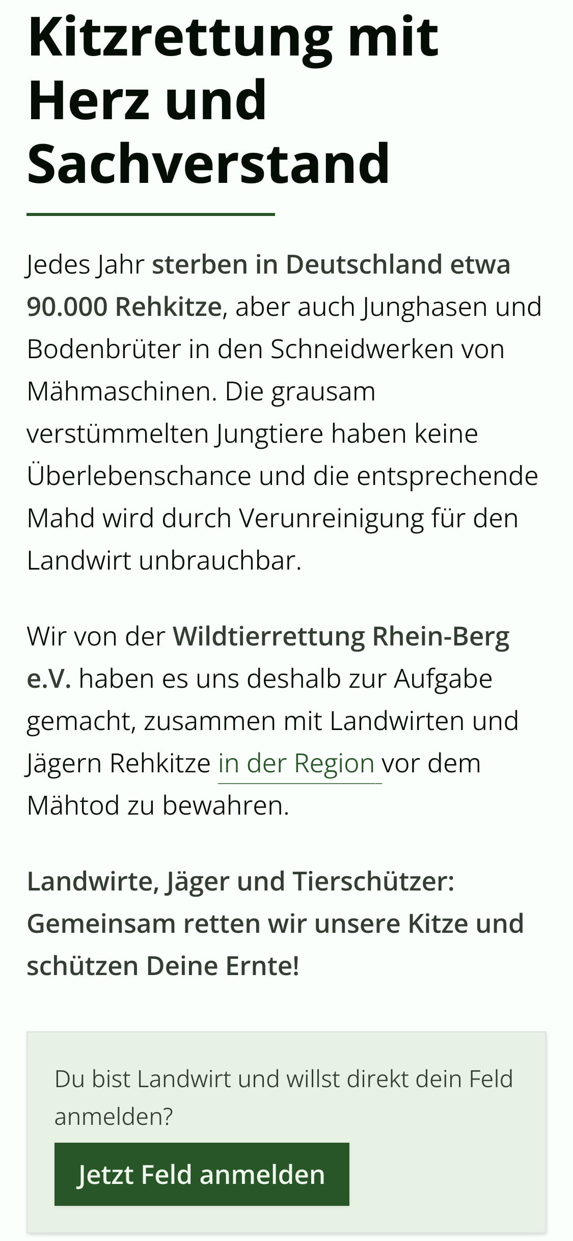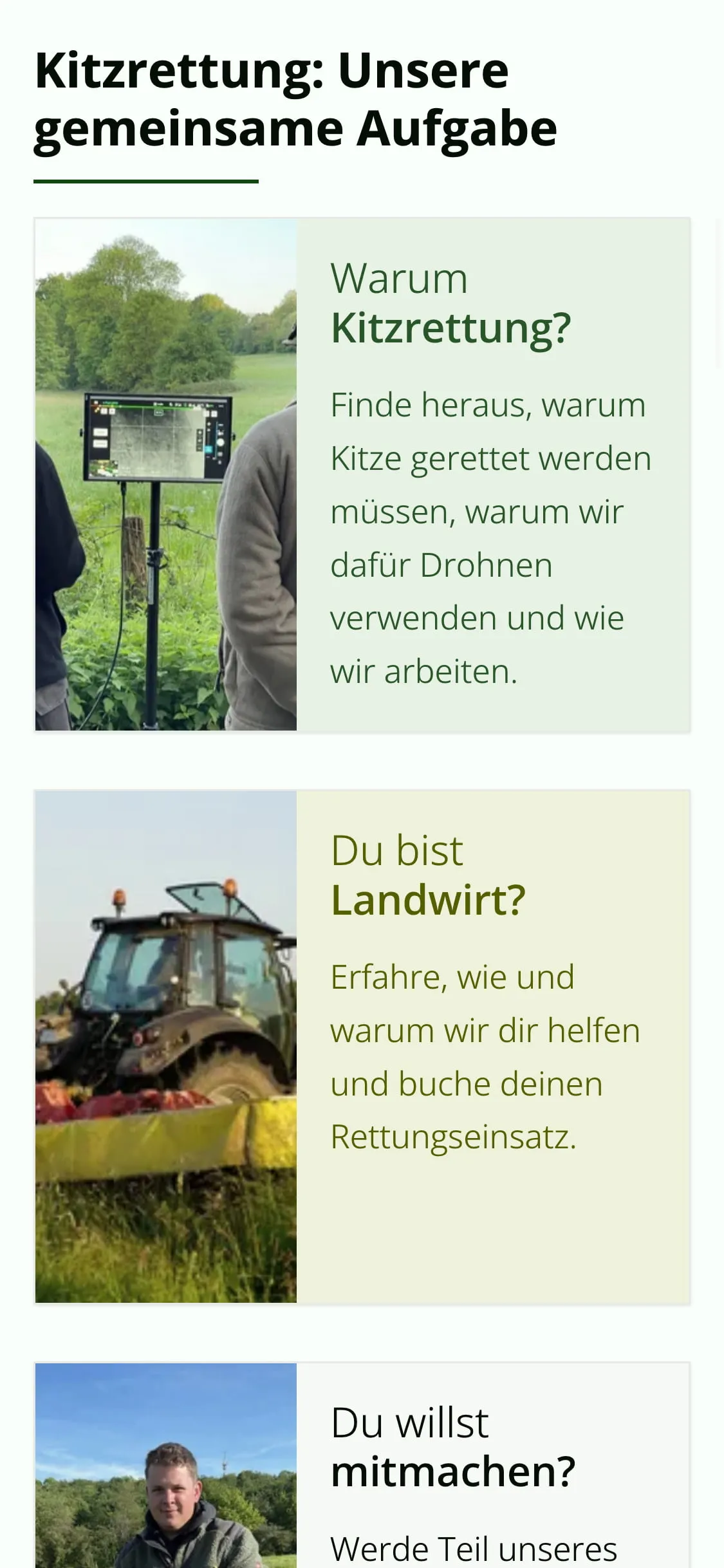 - Landwirt:innen sollen über die Vorteile informiert werden und es soll ihnen einfach gemacht werden, die Wildtierrettung zu beauftragen
